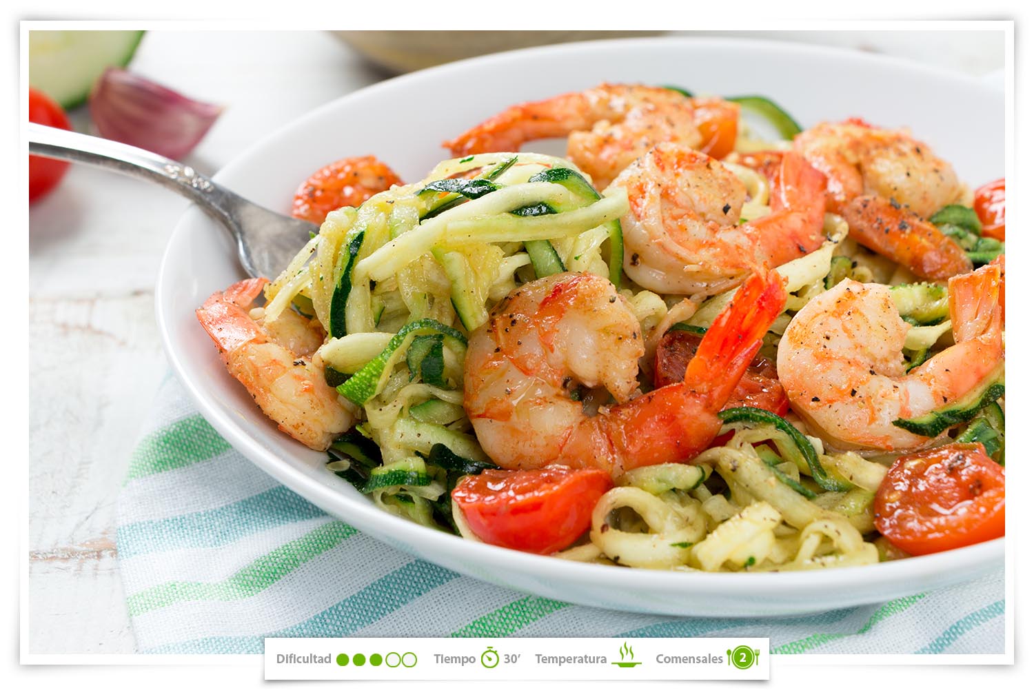SPAGUETTIS DE CALABACÍN CON TOMATE Y GAMBAS