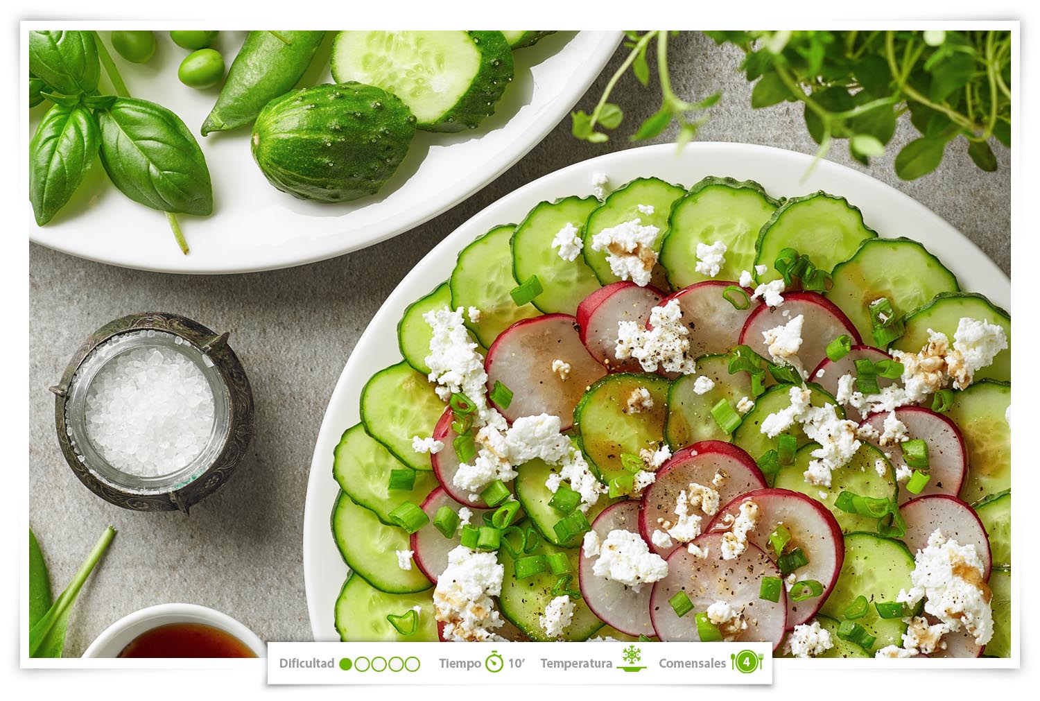 Primero, corta el pepino y el rábano en láminas muy finas, con ayuda de una mandolina.