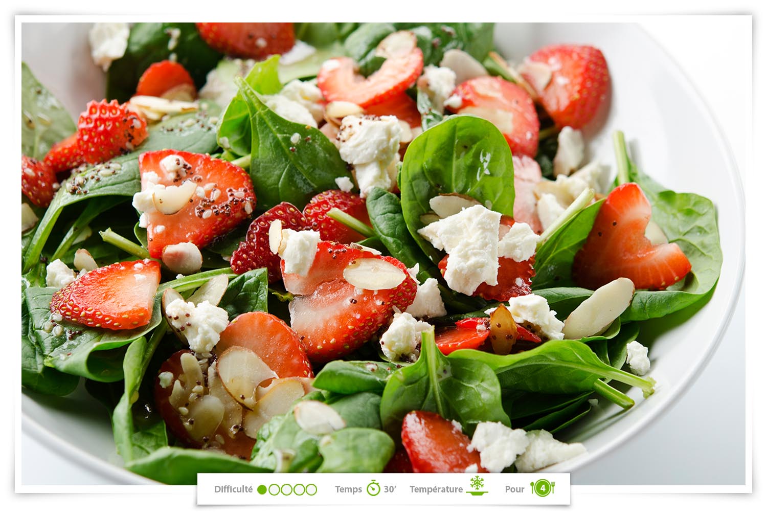Saupoudrer de graines. Arroser d’un trait de sauce vinaigrette à la fraise.