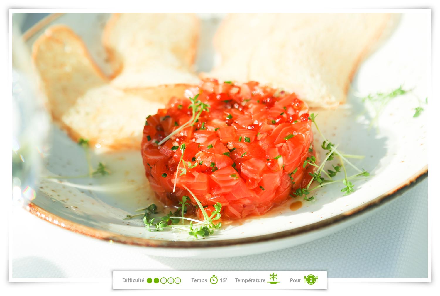 Remplissez un cercle à dresser avec le Tartare de tomate. Déposez des fines herbes pour le dressage..